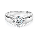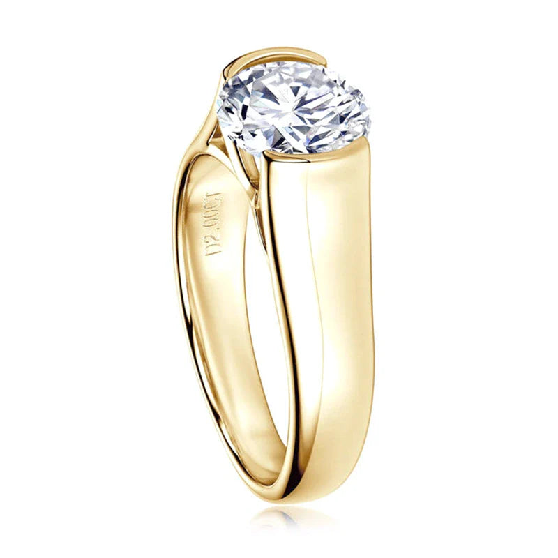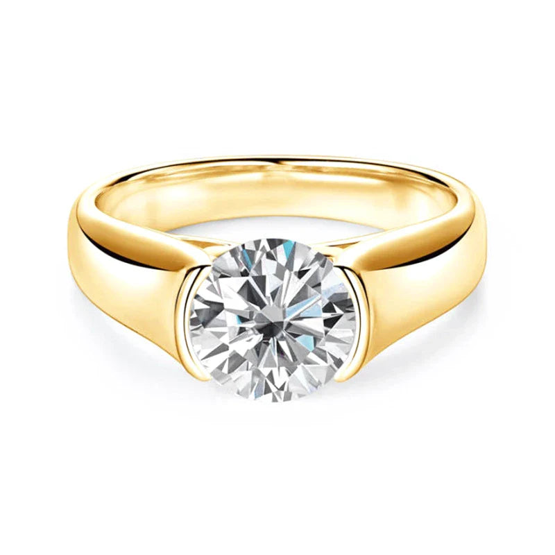 Combines modern sophistication with timeless elegance. The thick band offers a striking foundation, while the half bezel setting securely cradles the dazzling Moissanite stone, allowing its brilliant sparkle to shine through.