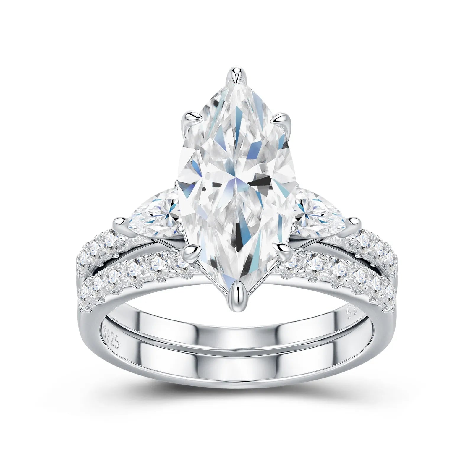 Double Pave Band Pear Side Stone Marquise Moissanite Bridal Set