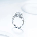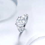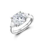 A striking three-stone design featuring a 5.0 carat cushion-cut moissanite, framed by two 4¡Á4mm triangle side stones. Clean lines and bold symmetry make this ring a statement of modern elegance.